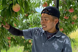果物王国山形県の大江町で、桃やりんご、ラ・フランスをメインに作っていらっしゃいます。神奈川県で生まれ農業とは縁遠い環境で育ちながら、いつしか自然を相手にして生計を立てる「農家」に憧れを!大学卒業後ドイツの果樹農家へ飛び込み、果物で人々に喜び、幸せを与える果物の可能性に魅了され2021年に農家としての歩みをスタートされました。